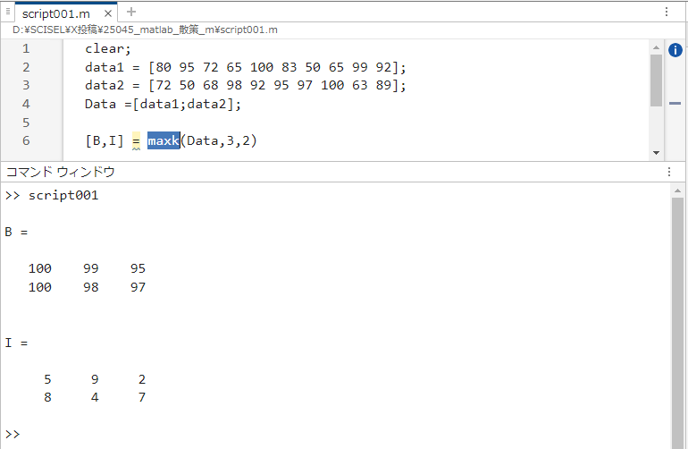 この関数は「配列の k 個の最大要素を検出」する機能とのことで、でR2016bで導入されたみたいです。上位k個のデータを関数一つで引っ張ってこれるのがうれしいですね😃。
