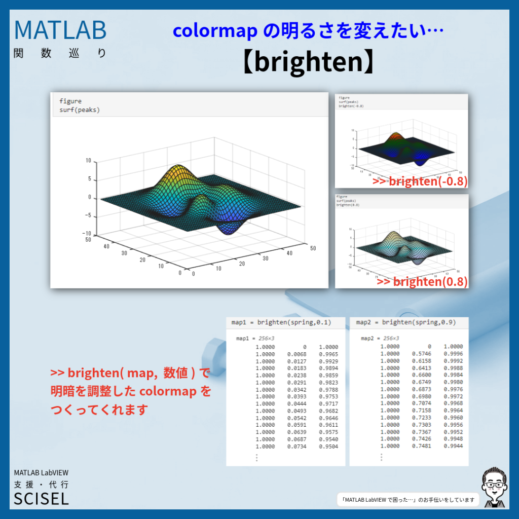 MATLABには多くのカラーマップが用意されていますが、「明るさを変えたい…」というタイミングもあるかと思います。そんな時に便利なのが、brighten関数です。この関数を使うと既に用意されているカラーマップの明暗を調整することができます。