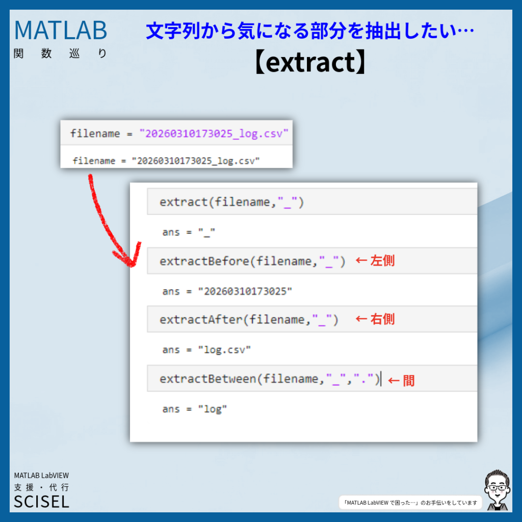 MATLABのextract系の関数は、文字列から部分的な情報を取り出すことができる関数です。私は、実験条件や計測データの種類をタイムスタンプとともにファイル名に含めることがあるのですが、そのような場合に必要な情報を簡単に取り出せるため、よく利用しています。