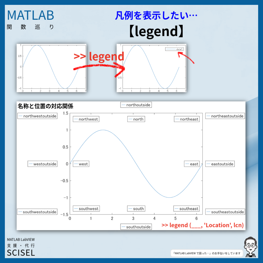 MATLABで「凡例を表示したい…」ときは>>legendを使っていますが、指定できるLocationもたくさんあるので、嬉しいですね