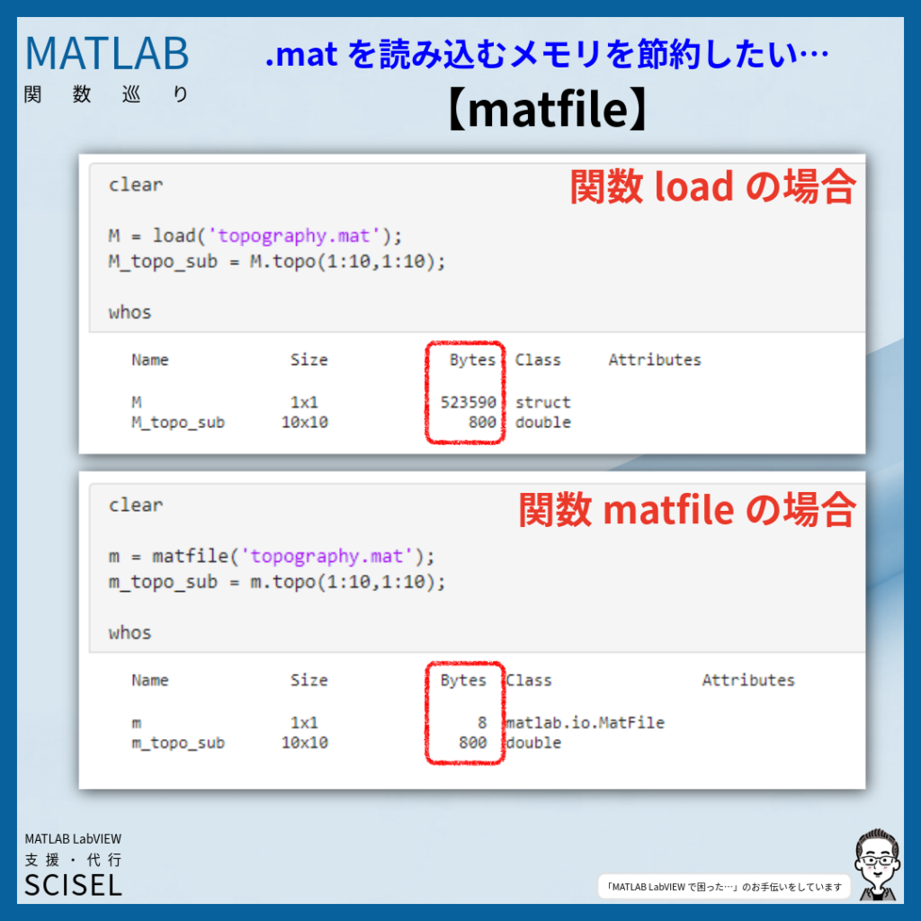 matfile を使うと、load 関数に比べて メモリ使用量を大幅に抑えることができます。